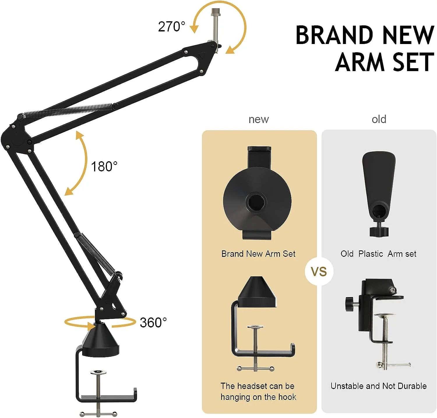 - [Brand New Arm Set] The extended durable steel boom arm offers 360� rotation with no noise so that users can freely adjust the mic to their preferred position and find a suitable distance for recording. The larger area desktop clip can be stably used on a desk that does not exceed 2.4 inches/60 mm in thickness. 4 cable ties help users organizing cable easily, prevent entanglement