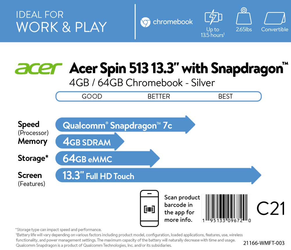 Acer Chromebook Spin 513 CP513-1H-S60F, 13.3" (1920 x 1080) Full HD IPS Multi-Touch Corning Gorilla Glass Display, Qualcomm® Snapdragon™ 7c Compute Platform, 4GB LPDDR4X, 64GB eMMC, 802.11ac WiFi 5, HD Webcam (1280 x 720), Convertible, Corning Gorilla Glass Touchpad, Chrome OS