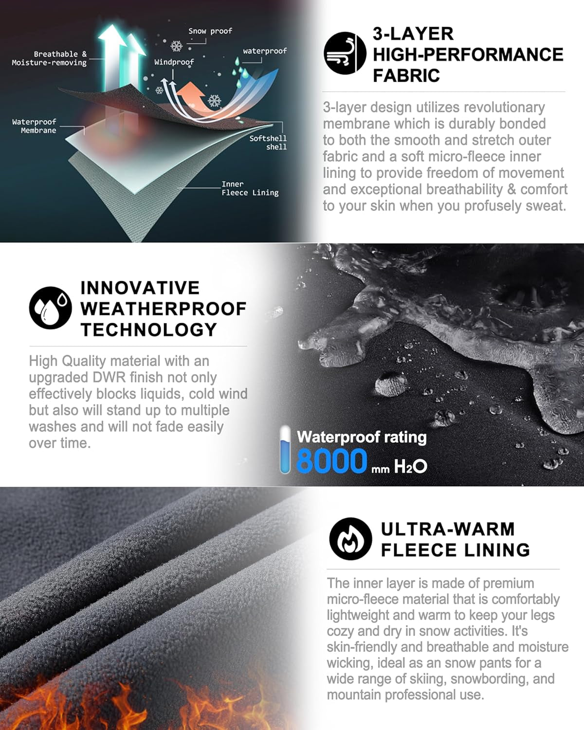The outer shell is waterproof, windproof, breathable and to keep you extremely warm with the mid-layer membrane and the inner soft micro-fleece lining offering the warmth to your legs. Four-way stretch fabric provides you good activities.