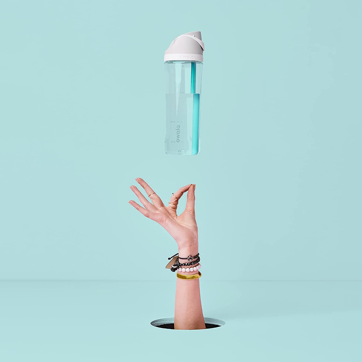The Owala FreeSip Tritan Water Bottle with Locking Push-Button Lid easily tackles every thirst. With a built-in, easy-clean straw and a wide-mouth opening, the FreeSip reusable bottle is designed for drinking two different ways: sipping upright through the straw or tilting back to swig from the wide-mouth spout opening. Add in a push-to-open lid and playful colors, and staying hydrated has never been simpler—or more fun. Additional features include a carry loop that doubles as a lock, a cup holder-friendly base, and a wide opening for easy cleaning and adding ice. The Owala FreeSip Tritan Water Bottle with Locking Push-Button Lid has a capacity of 25 ounces. Made from BPA- and phthalate-free, stain and odor-resistant durable Eastman Tritan plastic. Top-rack dishwasher safe. Manufacturer’s limited lifetime warranty.
